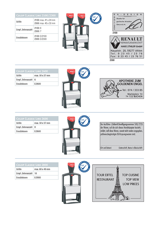 Schauen Sie einfach was Ihr Stemplerherz begehrt und bestellen Sie an Hand der vielfältigen Beispiele die Stempel Ihrer Wahl. Vom Holzstempel über den Selbstfärber bis hin zum Spezialstempel liefern wir Ihnen alles aus einer Hand. Aber auch unsere Top-Auswahl an Zubehör vom Kennzeichnungsgerät bis zum Verkehrsschild wird Sie begeistern und überzeugen. Testen Sie uns.