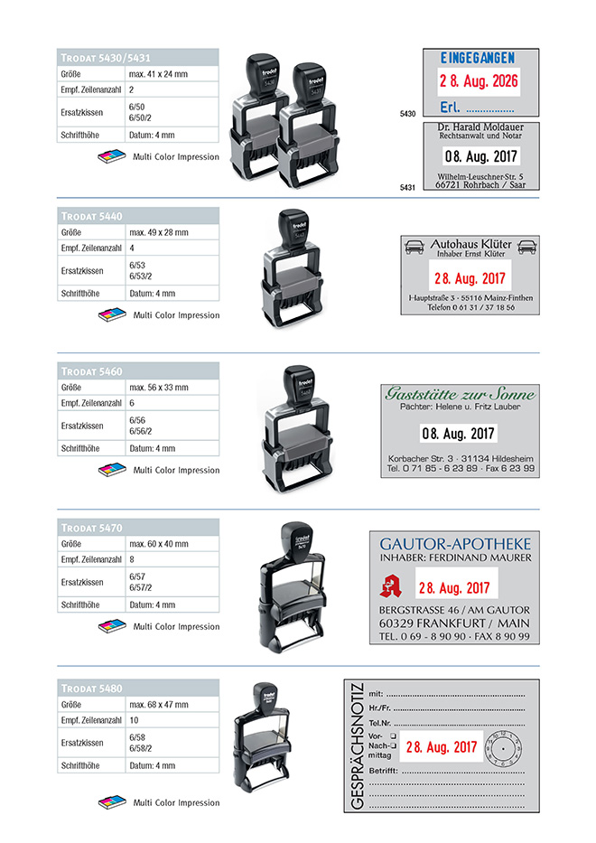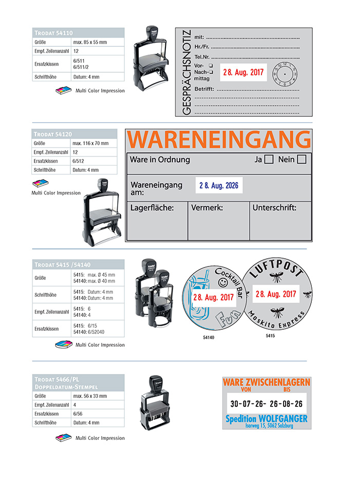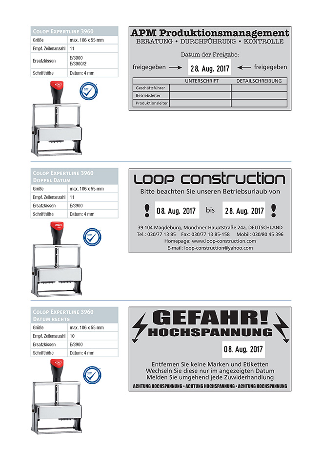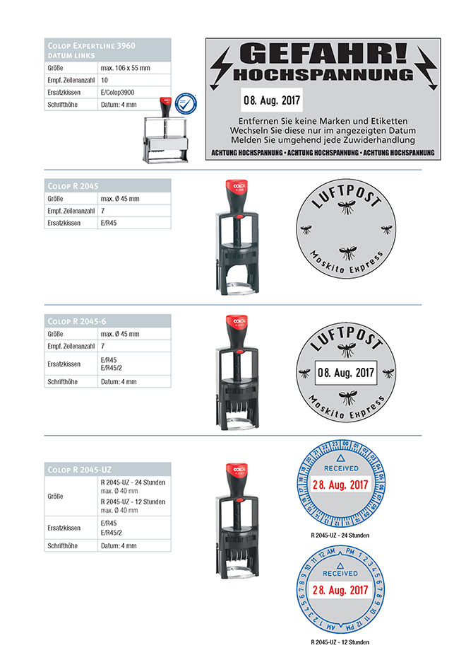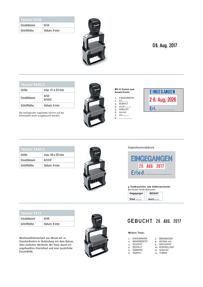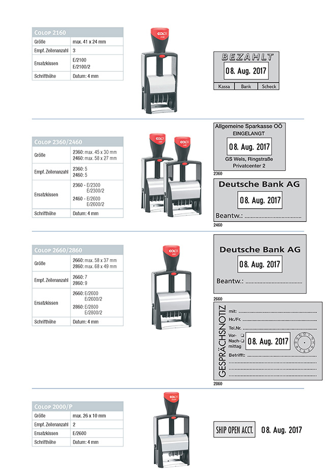 Datums- und Ziffernstempel. Stempel mit Fertigtexten und zum Selbersetzen.