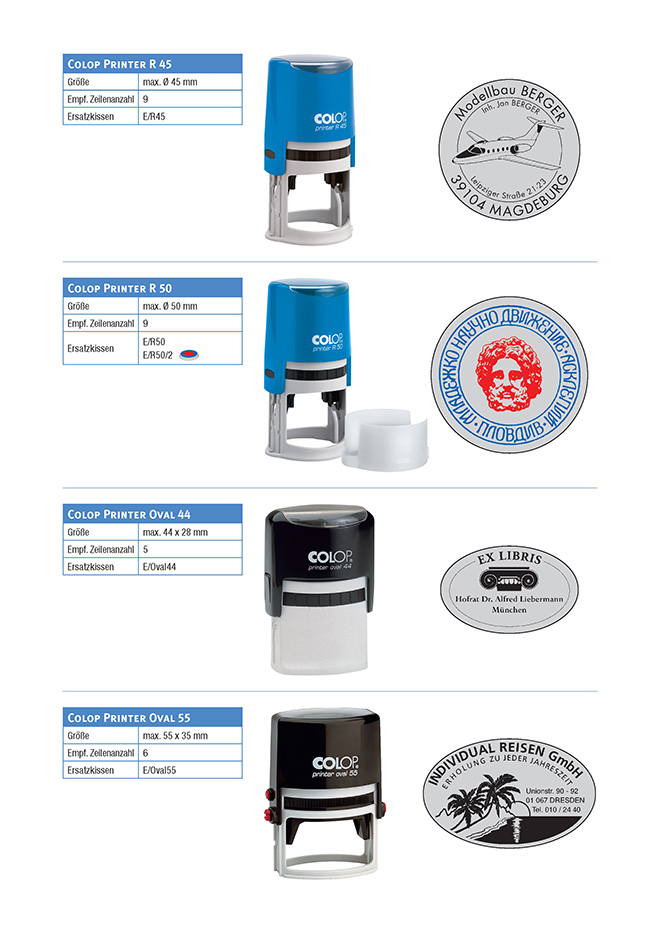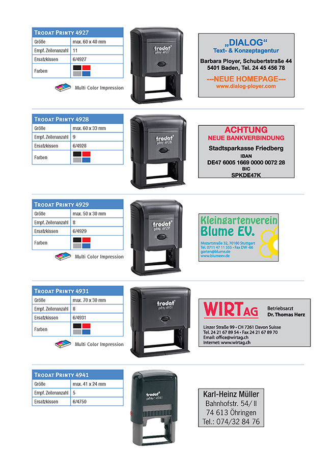 Schauen Sie einfach was Ihr Stemplerherz begehrt und bestellen Sie an Hand der vielfältigen Beispiele die Stempel Ihrer Wahl. Vom Holzstempel über den Selbstfärber bis hin zum Spezialstempel liefern wir Ihnen alles aus einer Hand. Aber auch unsere Top-Auswahl an Zubehör vom Kennzeichnungsgerät bis zum Verkehrsschild wird Sie begeistern und überzeugen. Testen Sie uns.